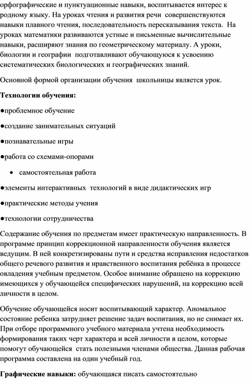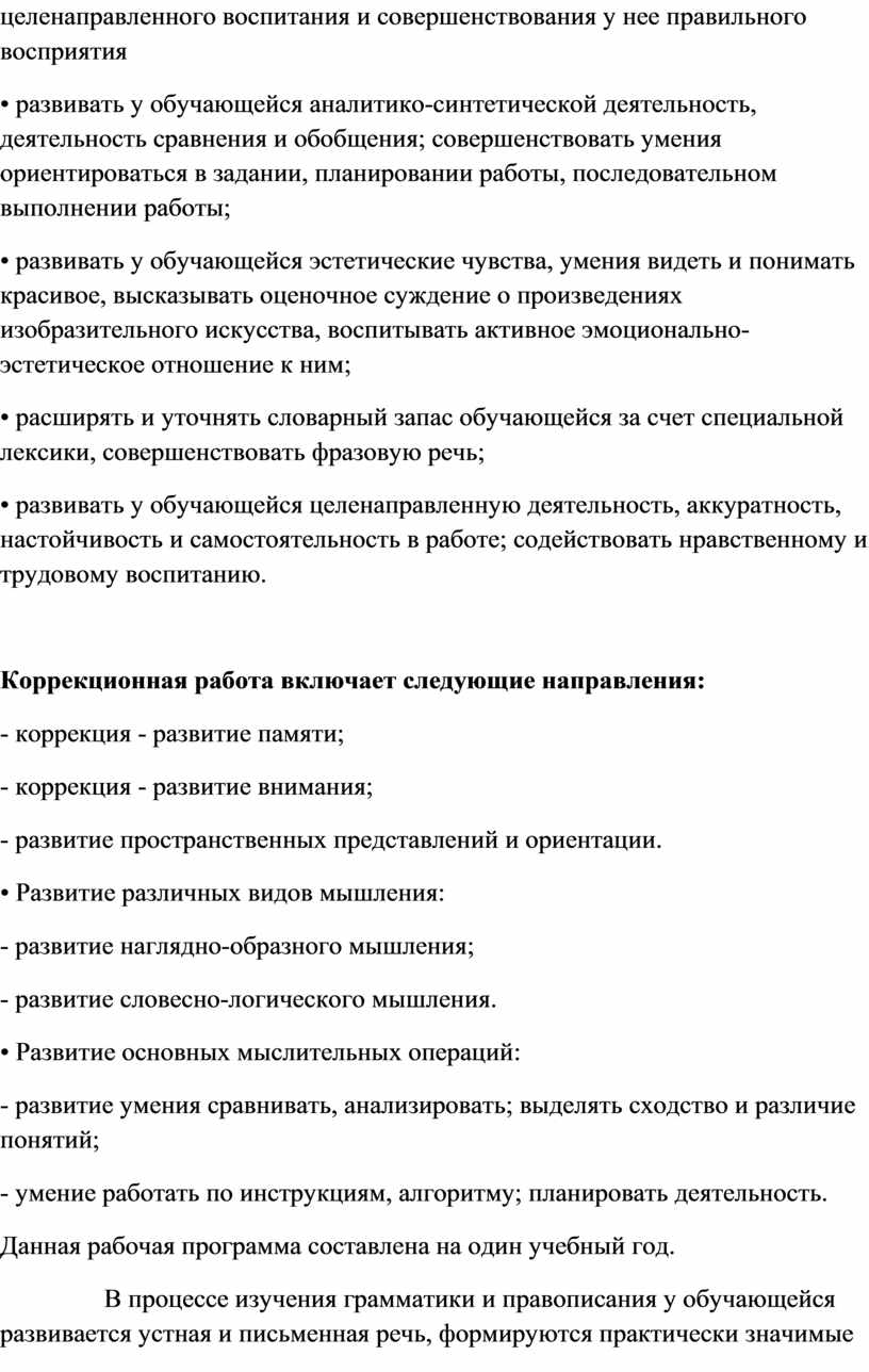 Содержание обучения по предметам имеет практическую направленность. В программе принцип коррекционной направленности обучения является ведущим. В ней конкретизированы пути и средства исправления недостатков общего речевого развития и нравственного воспитания ребёнка в процессе овладения учебным предметом. Особое внимание обращено на коррекцию имеющихся у обучающейся специфических нарушений, на коррекцию всей личности в целом.