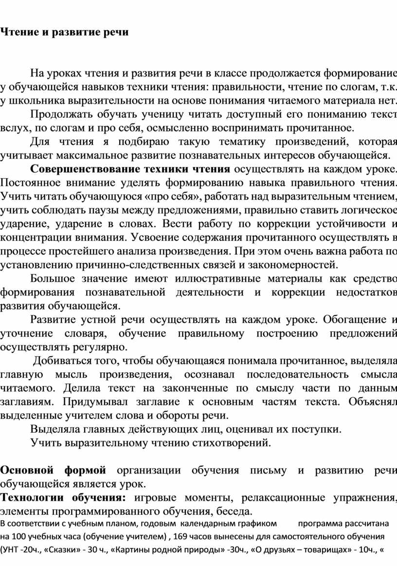 Обучение обучающейся носит воспитывающий характер. Аномальное состояние ребенка затрудняет решение задач воспитания, но не снимает их. При отборе программного учебного материала учтена необходимость формирования таких черт характера и всей личности в целом, которые помогут обучающейся стать полезными членами общества. Данная рабочая программа составлена на один учебный год.