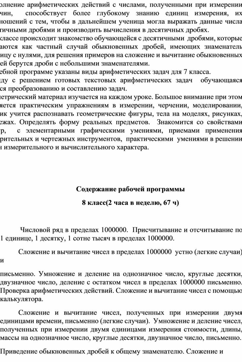Содержание обучения по предметам имеет практическую направленность. В программе принцип коррекционной направленности обучения является ведущим. В ней конкретизированы пути и средства исправления недостатков общего развития и нравственного воспитания ребенка в процессе овладения учебным предметом. Особое внимание обращено на коррекцию имеющихся у обучающейся специфических нарушений, на коррекцию всей личности в целом.