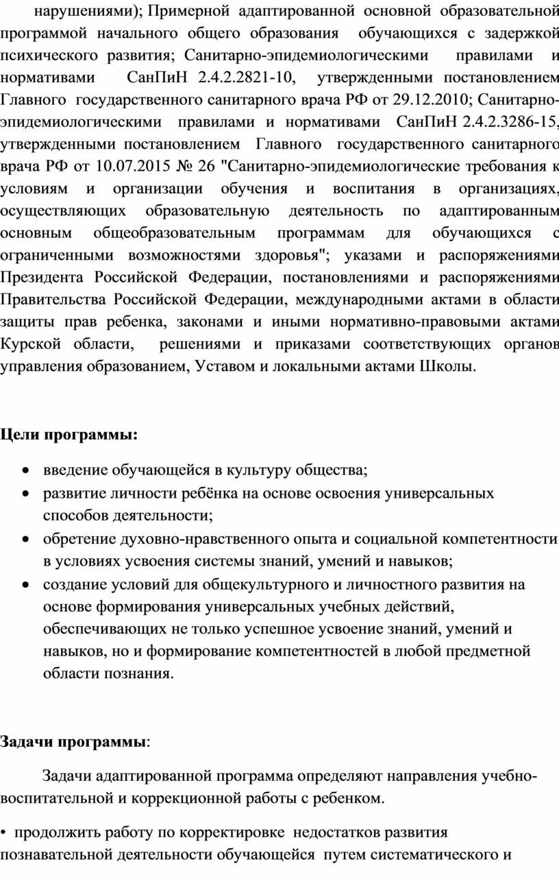 ОКОУ «Курская школа» в своей деятельности руководствуется Федеральным Законом от 29 декабря 2012г №273-ФЗ «Об образовании в Российской Федерации», Конституцией Российской Федерации, принятой 12 декабря 1993 г. (с учетом поправок, внесенных Законами Российской Федерации о поправках к Конституции Российской Федерации от 30.12.2008 № 6-ФКЗ и от 30.12.2008 № 7-ФКЗ), Конвенцией о правах ребенка (принята резолюцией 44/25 Генеральной Ассамблеи от 20 ноября 1989 года, вступила в силу 2 сентября 1990 года), Федеральным Законом от 24 июля 1998 г. № 124-ФЗ «Об основных гарантиях прав ребенка в Российской Федерации», Законом Курской области от 17 февраля 2000 г. № 13-ЗКО «Об образовании в Курской области» (в редакции от 30.12.2004) № 92-ЗКО, Федеральным государственным образовательным стандартом начального общего образования обучающихся с ограниченными возможностями здоровья; Федеральным государственным образовательным стандартом образования обучающихся с умственной отсталостью (интеллектуальными нарушениями); Примерной адаптированной основной образовательной программой образования обучающихся с умственной отсталостью (интеллектуальными нарушениями) на основе ФГОС образования обучающихся с умственной отсталостью (интеллектуальными нарушениями); Примерной адаптированной основной образовательной программой начального общего образования обучающихся с задержкой психического развития; Санитарно-эпидемиологическими правилами и нормативами СанПиН 2.4.2.2821-10, утвержденными постановлением Главного государственного санитарного врача РФ от 29.12.2010; Санитарно-эпидемиологическими правилами и нормативами СанПиН 2.4.2.3286-15, утвержденными постановлением Главного государственного санитарного врача РФ от 10.07.2015 № 26 "Санитарно-эпидемиологические требования к условиям и организации обучения и воспитания в организациях, осуществляющих образовательную деятельность по адаптированным основным общеобразовательным программам для обучающихся с ограниченными возможностями здоровья"; указами и распоряжениями Президента Российской Федерации, постановлениями и распоряжениями Правительства Российской Федерации, международными актами в области защиты прав ребенка, законами и иными нормативно-правовыми актами Курской области, решениями и приказами соответствующих органов управления образованием, Уставом и локальными актами Школы.