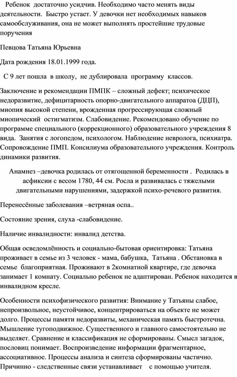 Особенности психофизического развития: Внимание у Татьяны слабое, непроизвольное, неустойчивое, концентрироваться на объекте не может долго. Процессы памяти недоразвиты, механическая память быстротечна. Мышление тугоподвижное. Существенного и главного самостоятельно не выделяет. Сравнение и классификация не сформированы. Смысл загадок, пословиц понимает. Воспроизведение информации фрагментарное, ассоциативное. Процессы анализа и синтеза сформированы частично. Причинно - следственные связи устанавливает с помощью учителя.