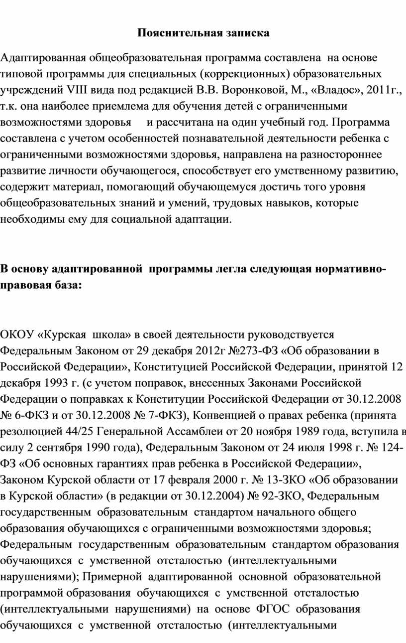 Адаптированная образовательная программа – нормативный документ общеобразовательного учреждения, созданный мной на основе программы под редакцией В.В.Воронковой, но с изменениями, дополнениями в содержании, последовательности изучения тем, количестве часов, использовании организационных форм обучения.
