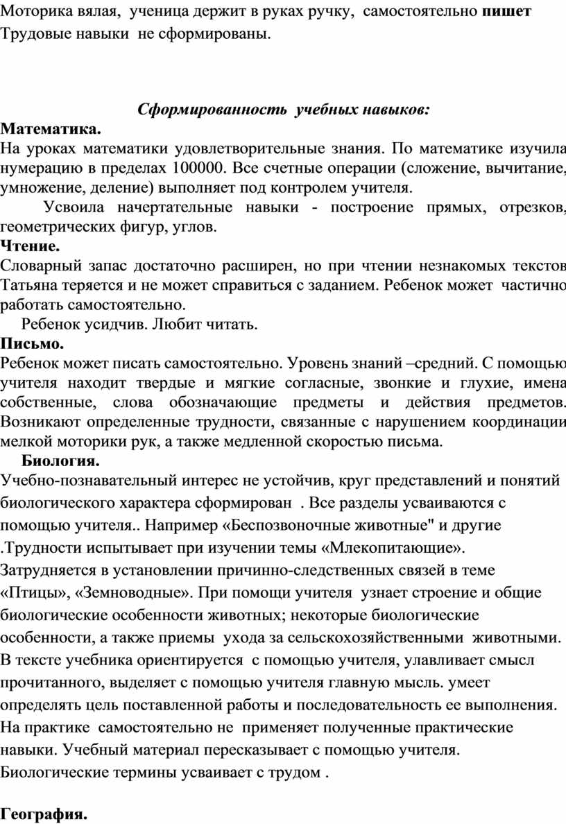 Моторика вялая, ученица держит в руках ручку, самостоятельно пишет Трудовые навыки не сформированы.