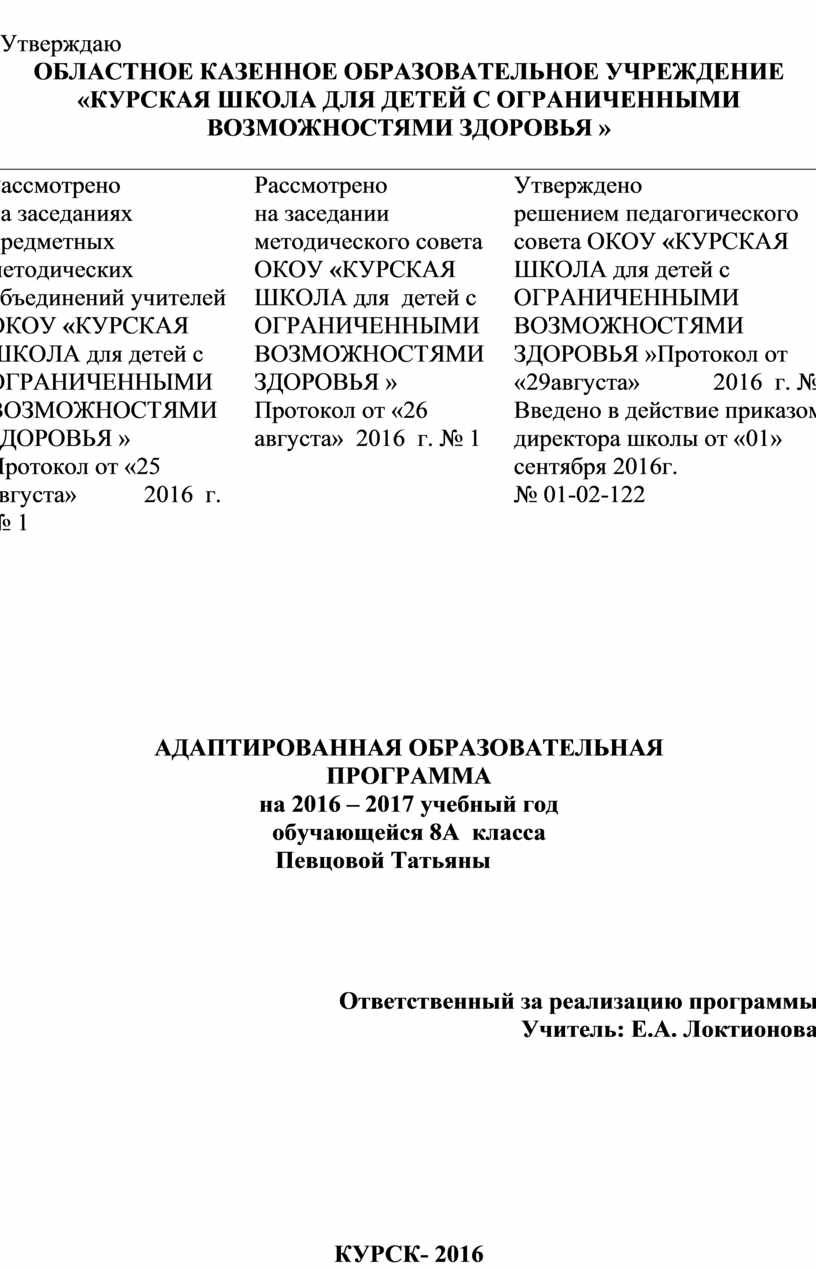 Утверждено решением педагогического совета ОКОУ «КУРСКАЯ ШКОЛА для детей с ОГРАНИЧЕННЫМИ ВОЗМОЖНОСТЯМИ ЗДОРОВЬЯ »Протокол от «29августа» 2016 г. № 1 Введено в действие приказом директора школы от «01» сентября 2016г. № 01-02-122