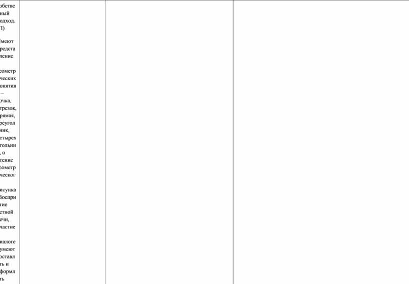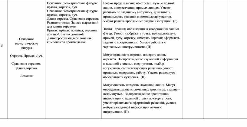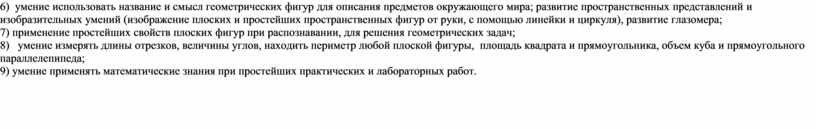 6) умение использовать название и смысл геометрических фигур для описания предметов окружающего мира; развитие пространственных представлений и изобразительных умений (изображение плоских и простейших пространственных фигур от руки, с помощью линейки и циркуля), развитие глазомера;