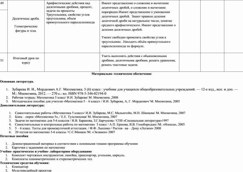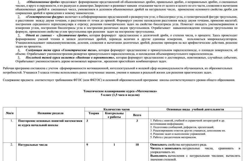 Содержание математического образования в 5 классе представлено разделом арифметика, который служит базой для дальнейшего изучения учащимися математики и способствует приобретению практических навыков в осуществлении арифметических операций, необходимых в повседневной жизни.