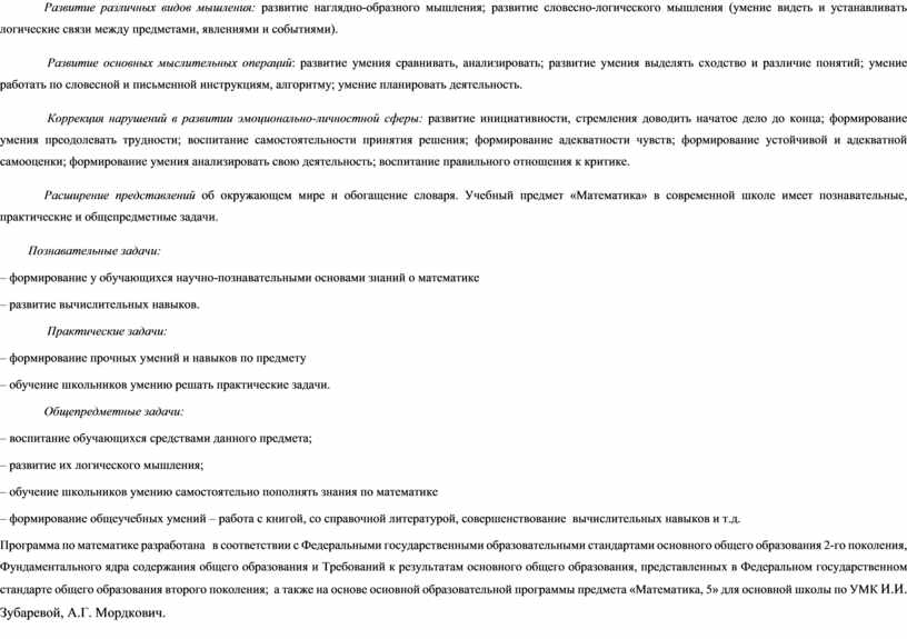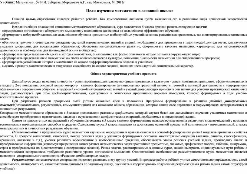 Программа по математике разработана в соответствии с Федеральными государственными образовательными стандартами основного общего образования 2-го поколения, Фундаментального ядра содержания общего образования и Требований к результатам основного общего образования, представленных в Федеральном государственном стандарте общего образования второго поколения; а также на основе основной образовательной программы предмета «Математика, 5» для основной школы по УМК И.И. Зубаревой, А.Г. Мордкович.