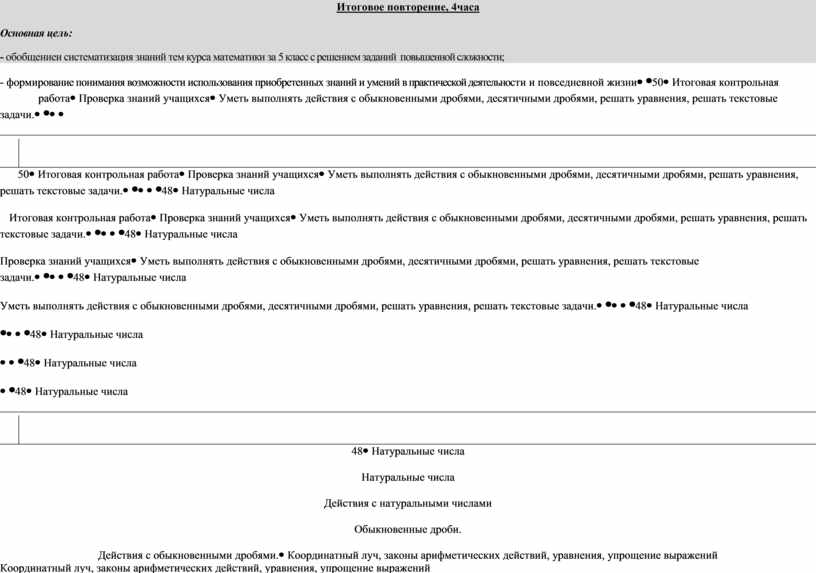 Итоговое повторение, 4часа Основная цель: - обобщениеи систематизация знаний тем курса математики за 5 класс с решением заданий повышенной сложности; - формирование понимания возможности использования приобретенных знаний и умений в практической деятельности и повседневной жизни |