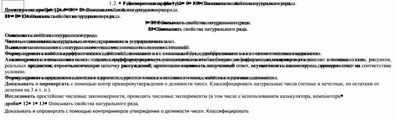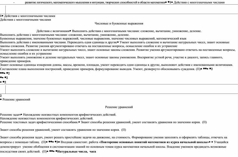 1. «Натуральные числа» основывается на повторении основных понятий математики из курса начальной школы, на формировании представлений о целостности и непрерывности курса математики начальной школы. Систематизирует знания о десятичной системе исчисления, о округлении натурального числа, о координатном луче, об уравнениях. Вводит понятие числового выражения, буквенного выражения и его числового значения. Закрепляет и развивает навыки сложения, вычитания, умножения и деления натуральных чисел. Продолжает формирование представлений о прямой, отрезке, ломанной, луче, прямоугольнике. Формирует умение сравнивать отрезки, находить длины отрезков, составлять формулы по условию задачи.