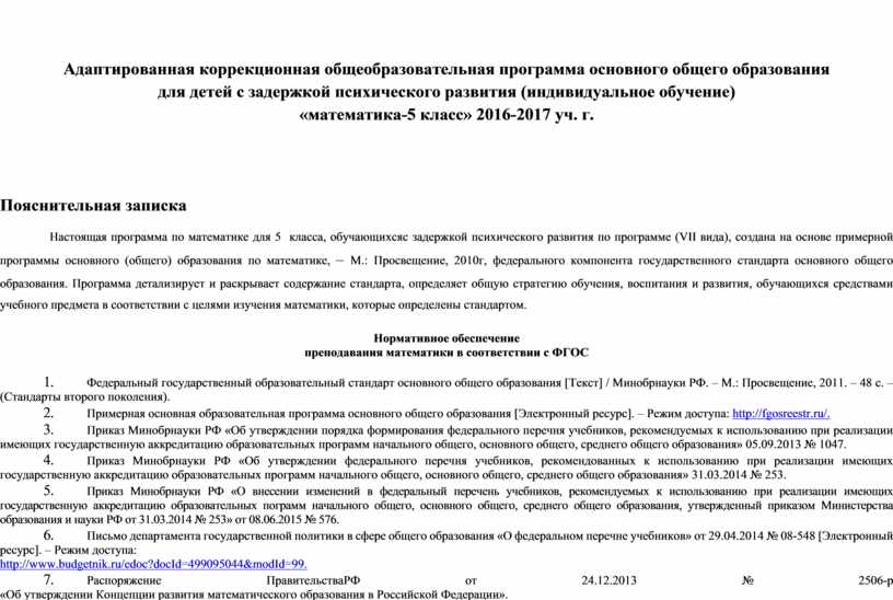Настоящая программа по математике для 5 класса, обучающихсяс задержкой психического развития по программе (VII вида), создана на основе примерной программы основного (общего) образования по математике, – М.: Просвещение, 2010г, федерального компонента государственного стандарта основного общего образования. Программа детализирует и раскрывает содержание стандарта, определяет общую стратегию обучения, воспитания и развития, обучающихся средствами учебного предмета в соответствии с целями изучения математики, которые определены стандартом.