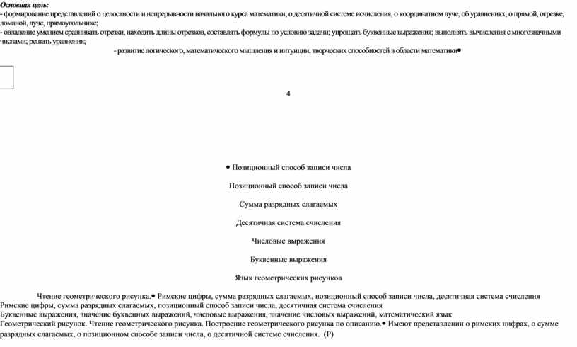 1) представление об основных изучаемых понятиях: число (натуральное и дробное), геометрическая фигура (плоская и объемная), уравнение;