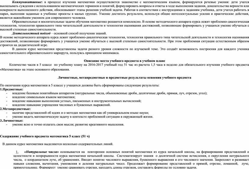 Количество часов в 5 классе по учебному плану на 2016-2017 учебный год 51 час из расчета 1,5 часа в неделю для обязательного изучения учебного предмета «Математика» на этапе основного образования.