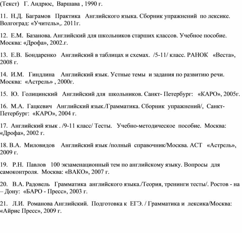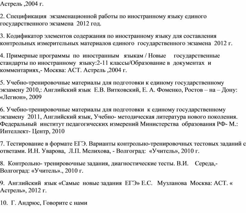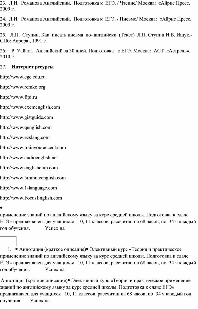 Литература 1. Федеральный компонент государственных стандартов основного общего и среднего (полного) общего образования по иностранному языку новые государственные стандарты по иностранному языку:2-11 классы/Образование в документах и комментариях,- Москва: АСТ. Астрель ,2004 г. 2. Спецификация экзаменационной работы по иностранному языку единого государственного экзамена 2012 год. 3. Кодификатор элементов содержания по иностранному языку для составления контрольных измерительных материалов единого государственного экзамена 2012 г. 4. Примерные программы по иностранным языкам / Новые государственные стандарты по иностранному языку:2-11 классы/Образование в документах и комментариях,- Москва: АСТ. Астрель ,2004 г. 5. Учебно-тренировочные материалы для подготовки к единому государственному экзамену 2010,: Английский язык Е.В. Витковский, Е. А. Фоменко, Ростов – на – Дону: «Легион», 2009 6. Учебно-тренировочные материалы для подготовки к единому государственному экзамену 2011, Английский язык, Учебно- методическая литература нового поколения. Федеральный институт педагогических измерений Министерства образования РФ- М.: Интеллект- Центр, 2010 7. Тестирование в формате ЕГЭ. Варианты контрольно-тренировочных тестовых заданий с ответами. И.Н. Уварова, Л.П. Мелихова, - Волгоград: «Учитель», 2010 г. 8. Контрольно- тренировочные задания, диагностические тесты. В.И. Середа,- Волгоград: «Учитель»., 2010 г. 9. Английский язык «Самые новые задания ЕГЭ» Е.С. Музланова Москва: АСТ. « Астрель», 2012 г. 10. Г. Андрюс, Говорите с нами (Текст) Г. Андрюс, Варшава , 1990 г. 11. Н.Д. Баграмов Практика Английского языка. Сборник упражнений по лексике. Волгоград: «Учитель»,. 2011г. 12. Е.М. Базанова. Английский для школьников старших классов. Учебное пособие. Москва: «Дрофа», 2002.г. 13. Е.В. Бондаренко Английский в таблицах и схемах. /5-11/ класс. РАНОК «Веста», 2008 г. 14. И.М. Гиндлина Английский язык. Устные темы и задания по развитию речи. Москва: «Астрель» , 2000г. 15. Ю. Голицинский Английский для школьников. Санкт- Петербург: «КАРО», 2005г. 16. М.А. Гацкевич Английский язык./Грамматика. Сборник упражнений/, Санкт- Петербург: «КАРО», 2004 г. 17. Английский язык . /9-11 класс/ Тесты. Учебно-методическое пособие. Москва: «Дрофа», 2002 г. 18. В.А. Миловидов Английский язык /полный справочник/Москва. АСТ «Астрель», 2009 г. 19. Р.Н. Павлов 100 экзаменационный тем по английскому языку. Вопросы для самоконтроля. Москва: «ВАКО», 2007 г. 20. В.А. Радовель Грамматика английского языка./Теория, тренинги тесты/. Ростов - на – Дону: «БАРО - Пресс», 2003 г. 21. Л.И. Романова Английский. Подготовка к ЕГЭ. / Грамматика и лексика/Москва: «Айрис Пресс», 2009 г. 23. Л.И. Романова Английский. Подготовка к ЕГЭ. / Чтение/ Москва: «Айрис Пресс, 2009 г. 24. Л.И. Романова Английский. Подготовка к ЕГЭ. / Письмо/ Москва: «Айрис Пресс, 2009 г. 25. Л.П. Ступин. Как писать письма по- английски. (Текст) Л.П. Ступин И.В. Ищук.- СПб: Аврора , 1991 г. 26. Р. Уайатт. Английский за 30 дней. Подготовка к ЕГЭ. Москва: АСТ «Астрель», 2010 г. 27. Интернет ресурсы http://www.ege.edu.ru http://www.rcmko.org http://www.fipi.ru http://www.exemenglish.com http://www.gistguide.com http://www.qenglish.com http://www.ezslang.com http://www.trainyouraccent.com http://www.audioenglish.net http://www.englishclub.com http://www.5minuteenglish.com http://www.1-language.com http://www.FocusEnglish.com