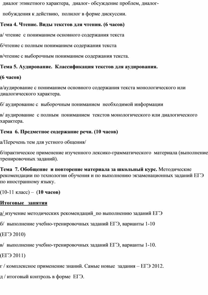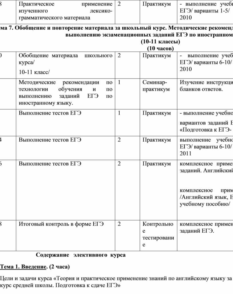 Тема 7. Обобщение и повторение материала за школьный курс. Методические рекомендации по технологии обучения и по выполнению экзаменационных заданий ЕГЭ по иностранному языку. (10-11 классы) (10 часов) |