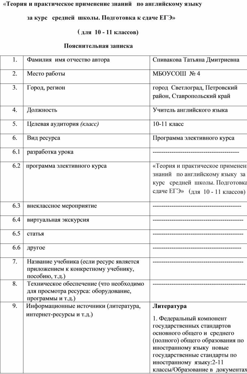 Элективный курс «Теория и практическое применение знаний по английскому языку за курс средней школы. Подготовка к сдаче ЕГЭ» предназначен для учащихся 10, 11 классов, рассчитан на 68 часов, по 34 ч каждый год обучения. Успех на экзамене во многом зависит от понимания особенностей его проведения и качества подготовки. Основы ЕГЭ – контрольно измерительные материалы (КИМ), структура и содержание, которых соответствует требованиям современных технологий экзаменационной проверки знаний и одновременно учитывает специфику предмета. Данная программа позволит познакомить обучающихся со структурой и содержанием КИМов и проверить свои знания по английскому языку за курс средней школы. Основная цель элективного курса – выявление уровня образовательных достижений выпускников средней школы для итоговой аттестации, подготовка к сдаче ЕГЭ. Такая оценка образовательных достижений не только позволяет контролировать знания и умения учеников выпускных классов, ЕГЭ дает равные возможности поступить в любой ВУЗ страны.