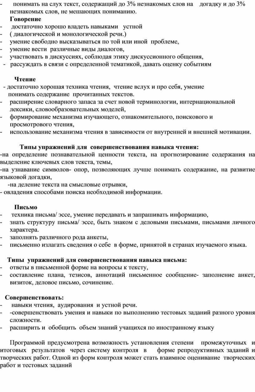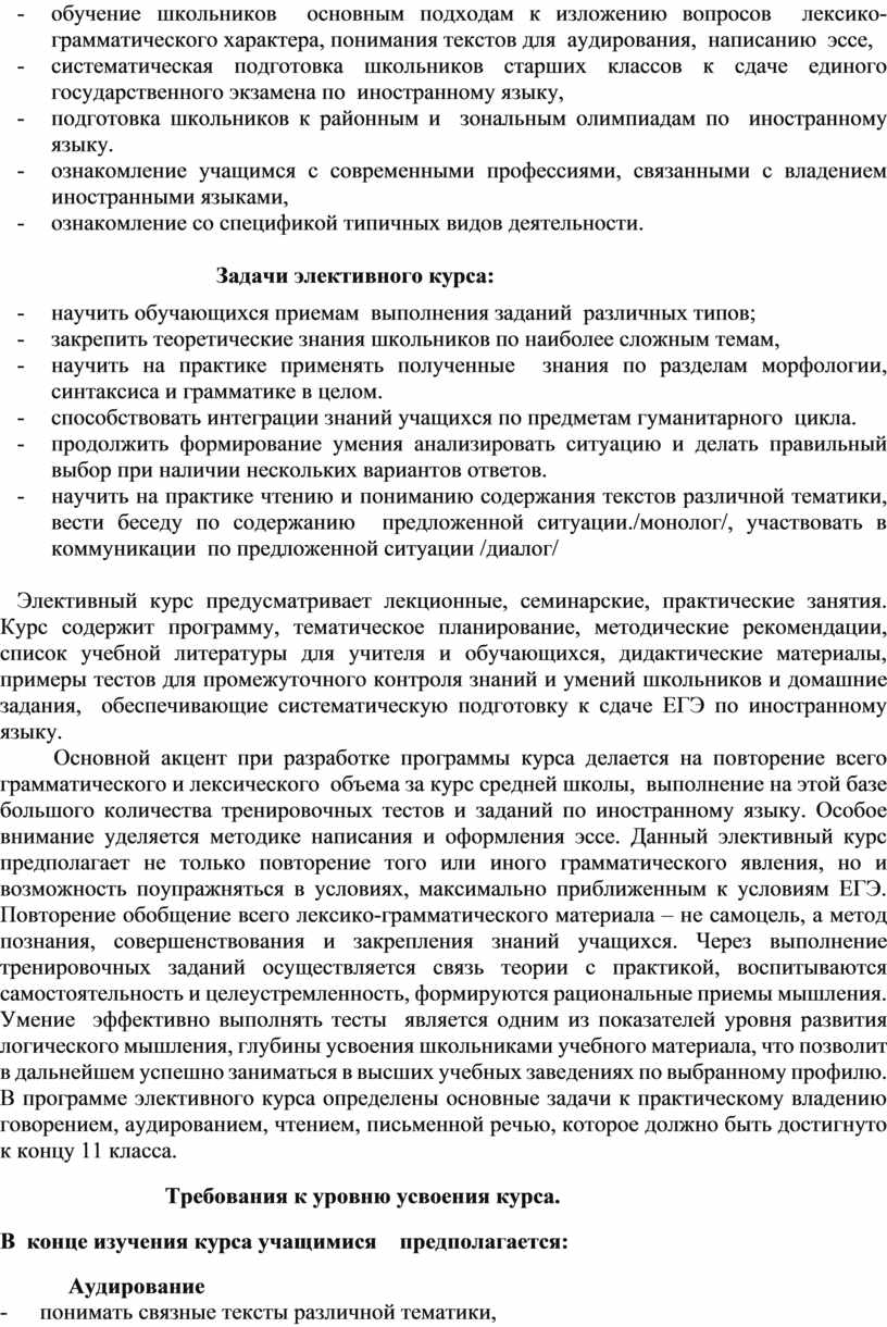 Основной акцент при разработке программы курса делается на повторение всего грамматического и лексического объема за курс средней школы, выполнение на этой базе большого количества тренировочных тестов и заданий по иностранному языку. Особое внимание уделяется методике написания и оформления эссе. Данный элективный курс предполагает не только повторение того или иного грамматического явления, но и возможность поупражняться в условиях, максимально приближенным к условиям ЕГЭ. Повторение обобщение всего лексико-грамматического материала – не самоцель, а метод познания, совершенствования и закрепления знаний учащихся. Через выполнение тренировочных заданий осуществляется связь теории с практикой, воспитываются самостоятельность и целеустремленность, формируются рациональные приемы мышления. Умение эффективно выполнять тесты является одним из показателей уровня развития логического мышления, глубины усвоения школьниками учебного материала, что позволит в дальнейшем успешно заниматься в высших учебных заведениях по выбранному профилю. В программе элективного курса определены основные задачи к практическому владению говорением, аудированием, чтением, письменной речью, которое должно быть достигнуто к концу 11 класса.