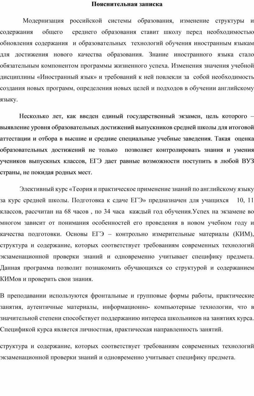 Элективный курс «Теория и практическое применение знаний по английскому языку за курс средней школы. Подготовка к сдаче ЕГЭ» предназначен для учащихся 10, 11 классов, рассчитан на 68 часов , по 34 часа каждый год обучения.Успех на экзамене во многом зависит от понимания особенностей его проведения в новом учебном году и качества подготовки. Основы ЕГЭ – контрольно измерительные материалы (КИМ), структура и содержание, которых соответствует требованиям современных технологий экзаменационной проверки знаний и одновременно учитывает специфику предмета. Данная программа позволит познакомить обучающихся со структурой и содержанием КИМов и проверить свои знания.