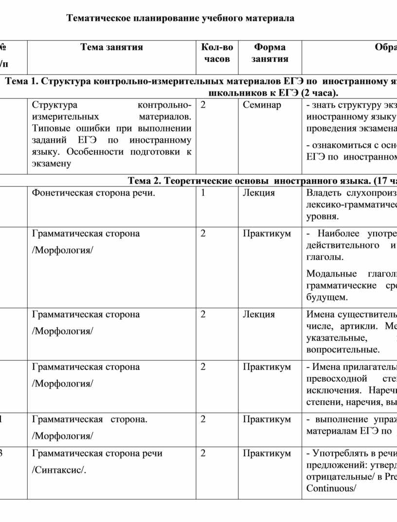 Элективный курс предусматривает лекционные, семинарские, практические занятия. Курс содержит программу, тематическое планирование, методические рекомендации, список учебной литературы для учителя и обучающихся, дидактические материалы, примеры тестов для промежуточного контроля знаний и умений школьников и домашние задания, обеспечивающие систематическую подготовку к сдаче ЕГЭ по иностранному языку.