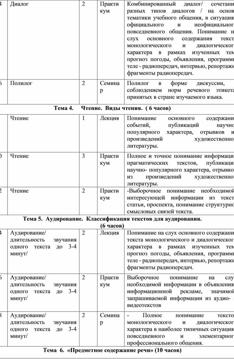 Тема 4. Чтение. Виды текстов для чтения. (6 часов)