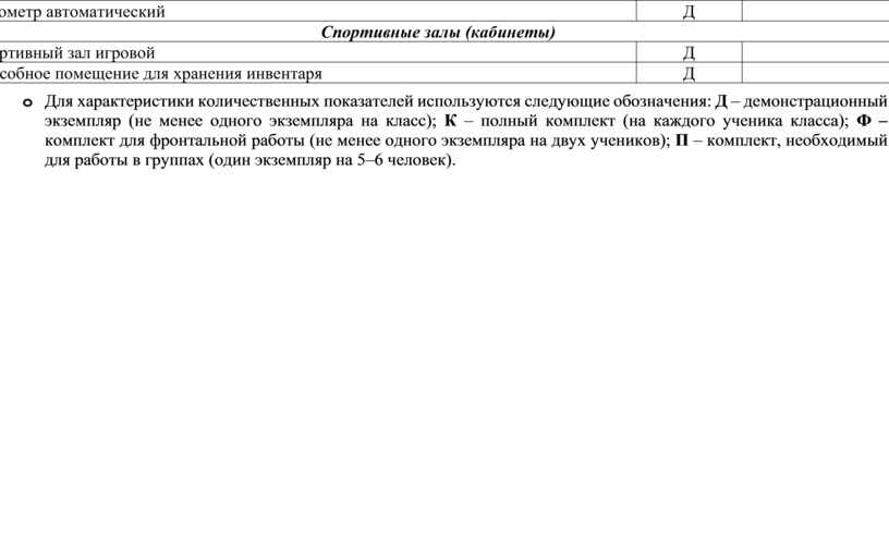 o Для характеристики количественных показателей используются следующие обозначения: Д – демонстрационный экземпляр (не менее одного экземпляра на класс); К – полный комплект (на каждого ученика класса); Ф – комплект для фронтальной работы (не менее одного экземпляра на двух учеников); П – комплект, необходимый для работы в группах (один экземпляр на 5–6 человек).