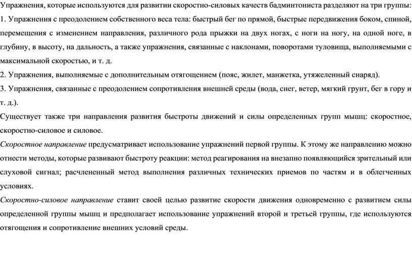 Упражнения, которые используются для развитии скоростно-силовых качеств бадминтониста разделяют на три группы: