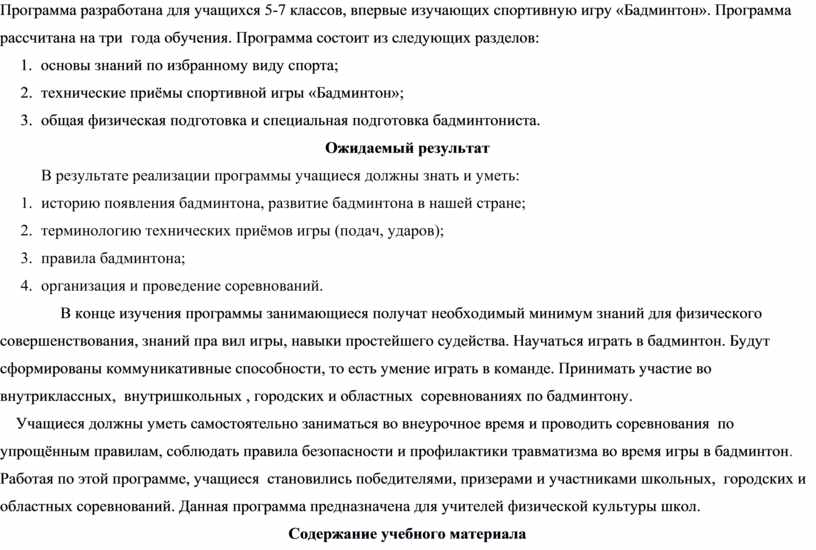Программа разработана для учащихся 5-7 классов, впервые изучающих спортивную игру «Бадминтон». Программа рассчитана на три года обучения. Программа состоит из следующих разделов: