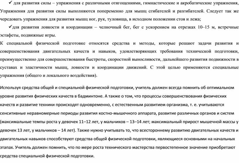 Используя средства общей и специальной физической подготовки, учитель должен всегда помнить об оптимальном уровне развития физических качеств в бадминтоне. А также о том, что процессы совершенствования физических качеств и развитие техники происходят одновременно, с естественным развитием организма, т. е. учитываются сенситивные неравномерные периоды развития костно-мышечного аппарата, развитие различных органов и систем (максимальные темпы роста у девочек 11–12 лет, у мальчиков – 13–14 лет; максимальный прирост мышечной массы у девочек 13 лет, у мальчиков – 14 лет). Также нужно учитывать то, что всестороннему развитию двигательных качеств и двигательных навыков способствуют средства общей физической подготовки, являющиеся основными на начальных этапах. Учитель должен помнить, что по мере роста технического мастерства первостепенное значение приобретают средства специальной физической подготовки.