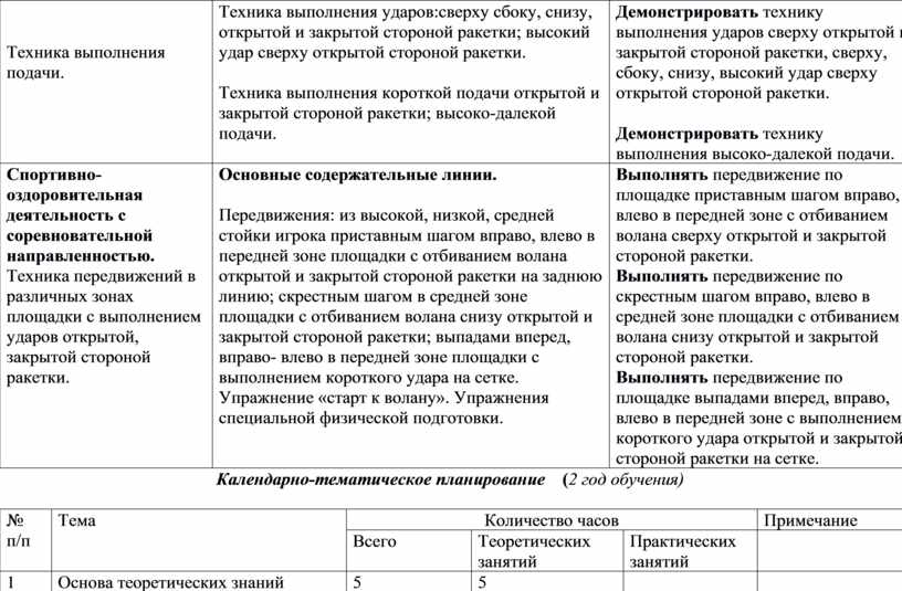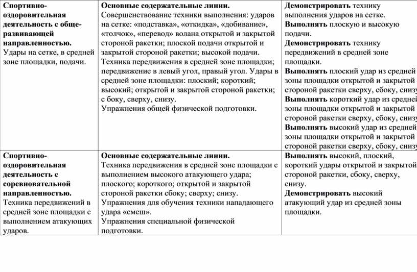 Способы держания (хватки) ракетки: универсальная, для удара открытой и закрытой стороной ракетки. Стойки: при подаче, при приеме, игровые; правосторонние, левосторонние; высокие, средние, низкие; атакующие, защитные, универсальные. Подачи: открытой и закрытой стороной ракетки; высоко-далекая, высокая, атакующая, плоская, короткая. Удары: фронтальные, нефронтальные; открытой и закрытой стороной ракетки; сверху, сбоку, снизу; высоко-далекий; высокий атакующий; атакующий («смеш», «полусмеш»); плоский; укороченный; сброс на сетке; подставка; подкрутка, в «противоход». Передвижения: вперед, назад, в сторону; простой, переменный, приставной, перекрестный; выпад, прыжок, бег. Упражнения для развития гибкости и подвижности в суставах. Упражнения для развития силы кисти. Упражнения для развития быстроты. Упражнения для развития ориентации в пространстве, равновесия, реагирующей способности. Упражнения на расслабление.