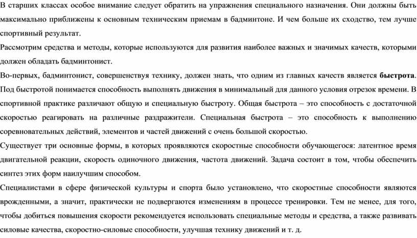 Рассмотрим средства и методы, которые используются для развития наиболее важных и значимых качеств, которыми должен обладать бадминтонист.
