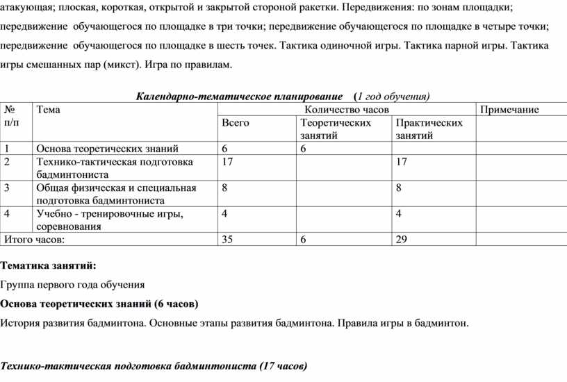 Технико-тактическая подготовка бадминтониста (17 часов)
