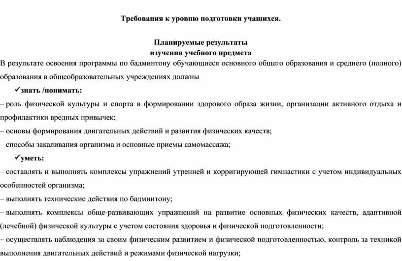 Учащиеся должны уметь самостоятельно заниматься во внеурочное время и проводить соревнования по упрощённым правилам, соблюдать правила безопасности и профилактики травматизма во время игры в бадминтон.