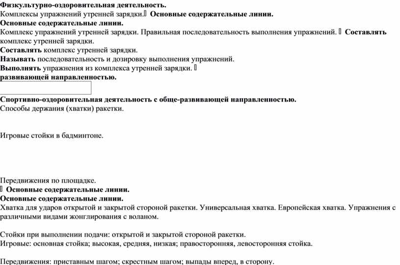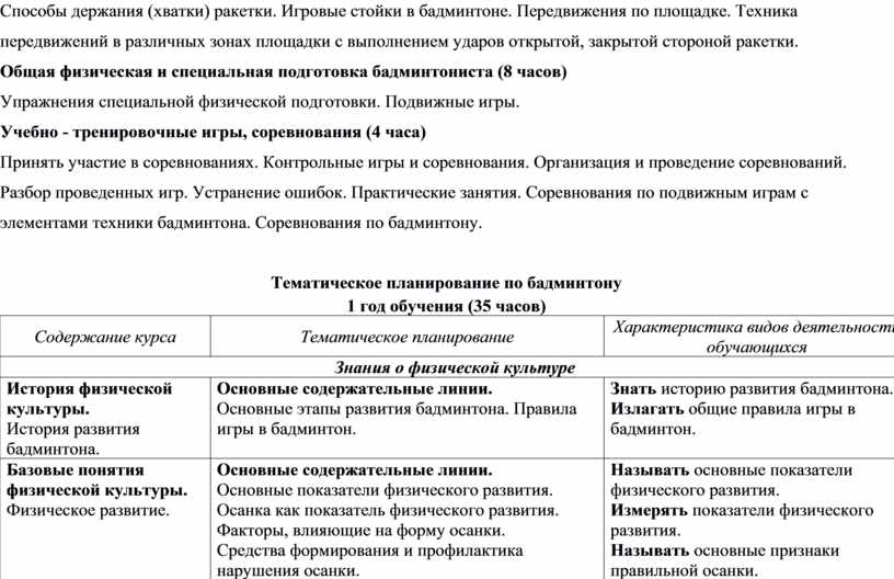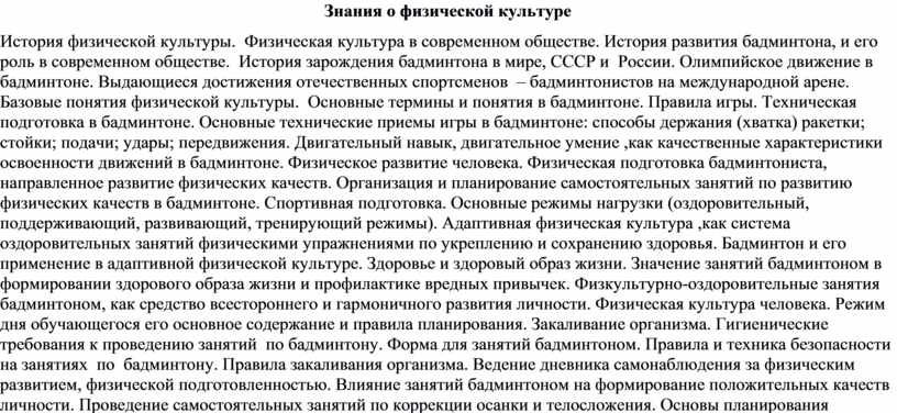 История физической культуры. Физическая культура в современном обществе. История развития бадминтона, и его роль в современном обществе. История зарождения бадминтона в мире, СССР и России. Олимпийское движение в бадминтоне. Выдающиеся достижения отечественных спортсменов – бадминтонистов на международной арене. Базовые понятия физической культуры. Основные термины и понятия в бадминтоне. Правила игры. Техническая подготовка в бадминтоне. Основные технические приемы игры в бадминтоне: способы держания (хватка) ракетки; стойки; подачи; удары; передвижения. Двигательный навык, двигательное умение ,как качественные характеристики освоенности движений в бадминтоне. Физическое развитие человека. Физическая подготовка бадминтониста, направленное развитие физических качеств. Организация и планирование самостоятельных занятий по развитию физических качеств в бадминтоне. Спортивная подготовка. Основные режимы нагрузки (оздоровительный, поддерживающий, развивающий, тренирующий режимы). Адаптивная физическая культура ,как система оздоровительных занятий физическими упражнениями по укреплению и сохранению здоровья. Бадминтон и его применение в адаптивной физической культуре. Здоровье и здоровый образ жизни. Значение занятий бадминтоном в формировании здорового образа жизни и профилактике вредных привычек. Физкультурно-оздоровительные занятия бадминтоном, как средство всестороннего и гармоничного развития личности. Физическая культура человека. Режим дня обучающегося его основное содержание и правила планирования. Закаливание организма. Гигиенические требования к проведению занятий по бадминтону. Форма для занятий бадминтоном. Правила и техника безопасности на занятиях по бадминтону. Правила закаливания организма. Ведение дневника самонаблюдения за физическим развитием, физической подготовленностью. Влияние занятий бадминтоном на формирование положительных качеств личности. Проведение самостоятельных занятий по коррекции осанки и телосложения. Основы планирования тренировочных занятий в бадминтоне, их структура и содержание. Правила проведения восстановительных процедур: дыхательная гимнастика, восстановительный массаж, проведение банных процедур. Правила оказания доврачебной помощи во время занятий физической культурой и спортом.
