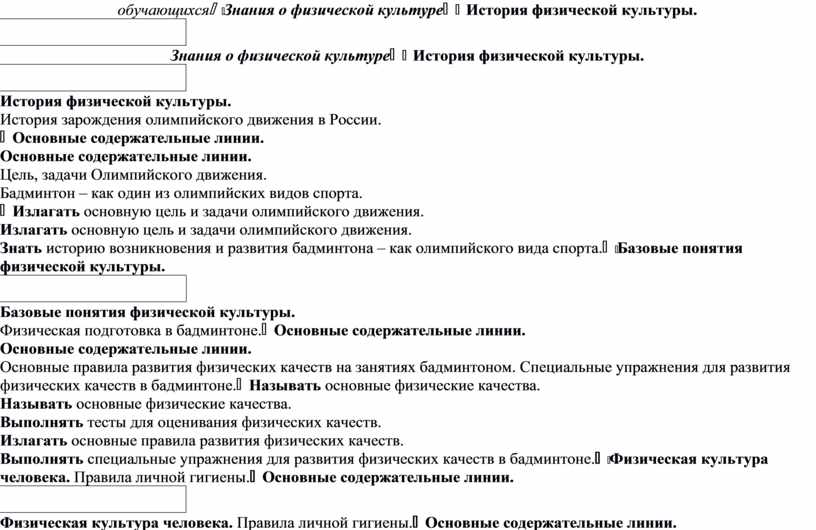 Основные содержательные линии. Основные этапы развития бадминтона. Правила игры в бадминтон. |