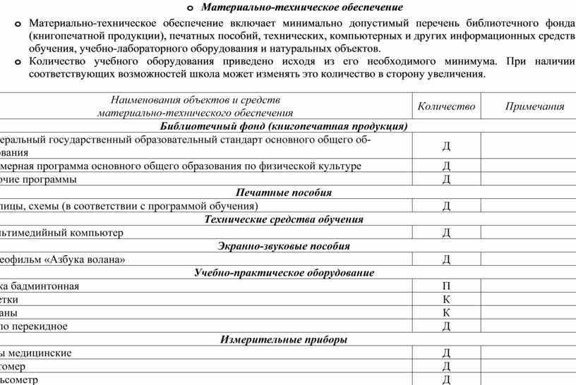 o Материально-техническое обеспечение включает минимально допустимый перечень библиотечного фонда (книгопечатной продукции), печатных пособий, технических, компьютерных и других информационных средств обучения, учебно-лабораторного оборудования и натуральных объектов.