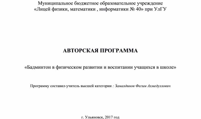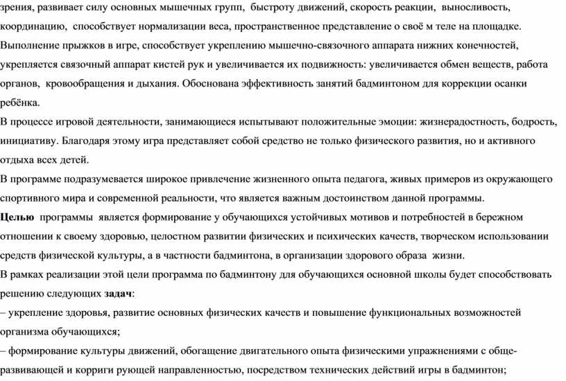 Авторская программа «Бадминтон в школе» составлена на базе уже существующей программы по предмету «Физическая культура» на основе бадминтона для обучающихся 5–9 классов разработанная в соответствии с требованиями Федерального государственного образовательного стандарта основного общего образования и для обучающихся 10–11 классов, которая соответствует государственному образовательному стандарту среднего полного образования.
