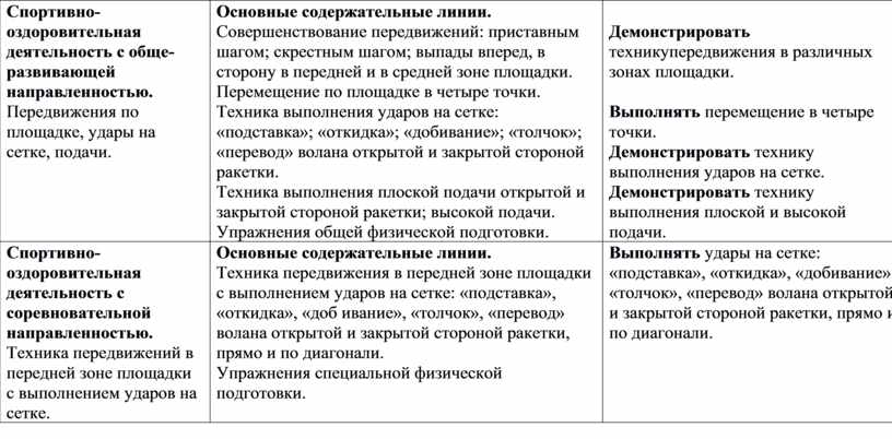 Спортивно-оздоровительная деятельность с соревновательной направленностью. Упражнения специальной технической подготовки. Упражнения с ракеткой; с воланом; с поролоновым шариком; выполняемые с ракеткой одним и двумя воланами. Стойки: при подаче, приеме волана. Удары: укороченные (сброс, подставка) выполняемые на сетке; добивание волана на сетке; короткий удар с задней линии площадки; атакующий удар («смеш»); прием короткого удара справа, слева, с отбросом на заднюю линию; прием удара «смеш». Подачи: высоко-далекая; атакующая; плоская, короткая, открытой и закрытой стороной ракетки. Передвижения: по зонам площадки; передвижение обучающегося по площадке в три точки; передвижение обучающегося по площадке в четыре точки; передвижение обучающегося по площадке в шесть точек. Тактика одиночной игры. Тактика парной игры. Тактика игры смешанных пар (микст). Игра по правилам.