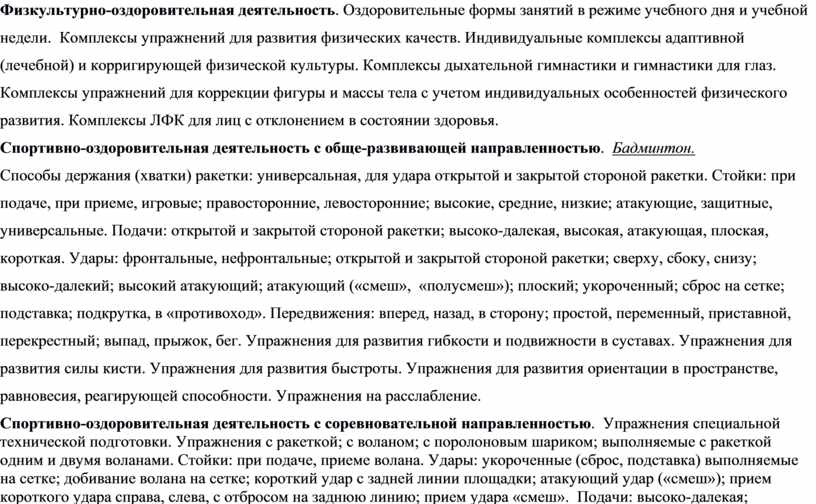 Физкультурно-оздоровительная деятельность. Оздоровительные формы занятий в режиме учебного дня и учебной недели. Комплексы упражнений для развития физических качеств. Индивидуальные комплексы адаптивной (лечебной) и корригирующей физической культуры. Комплексы дыхательной гимнастики и гимнастики для глаз. Комплексы упражнений для коррекции фигуры и массы тела с учетом индивидуальных особенностей физического развития. Комплексы ЛФК для лиц с отклонением в состоянии здоровья.
