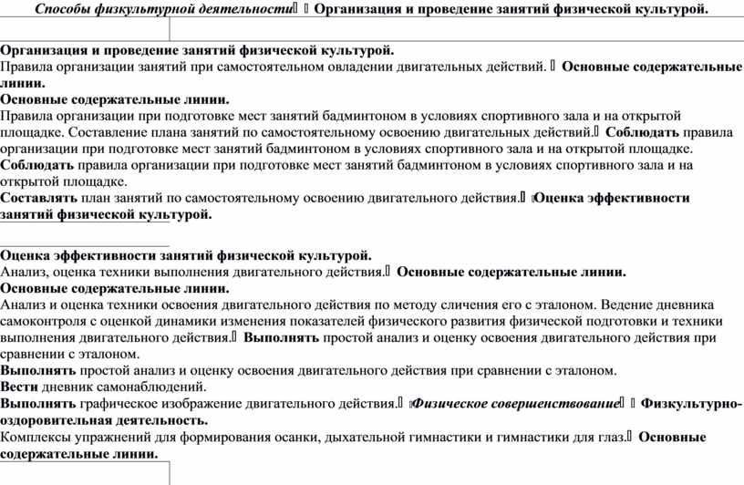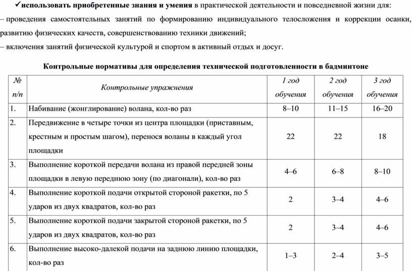· освоению умений самостоятельно организовывать занятия по бадминтону, регулировать физические нагрузки на этих занятиях, т. е., обучающиеся самостоятельно должны отбирать средства и методы занятий, организовывать занятия, определять эффективность занятий в соответствии с поставленной задачей, ориентируясь на индивидуальные показатели физического развития и физической подготовленности;