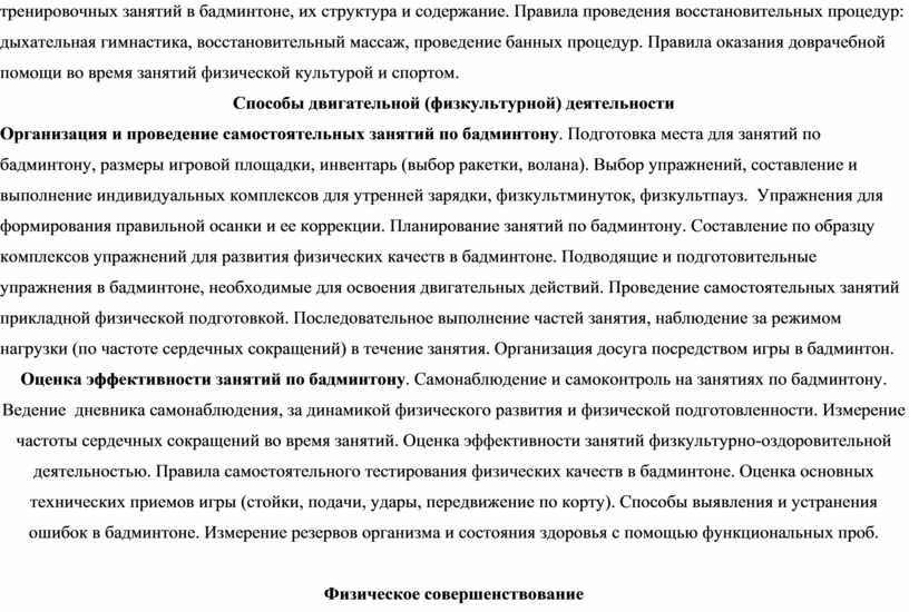 Организация и проведение самостоятельных занятий по бадминтону. Подготовка места для занятий по бадминтону, размеры игровой площадки, инвентарь (выбор ракетки, волана). Выбор упражнений, составление и выполнение индивидуальных комплексов для утренней зарядки, физкультминуток, физкультпауз. Упражнения для формирования правильной осанки и ее коррекции. Планирование занятий по бадминтону. Составление по образцу комплексов упражнений для развития физических качеств в бадминтоне. Подводящие и подготовительные упражнения в бадминтоне, необходимые для освоения двигательных действий. Проведение самостоятельных занятий прикладной физической подготовкой. Последовательное выполнение частей занятия, наблюдение за режимом нагрузки (по частоте сердечных сокращений) в течение занятия. Организация досуга посредством игры в бадминтон.