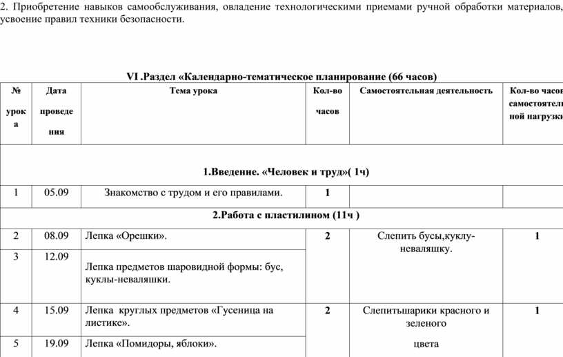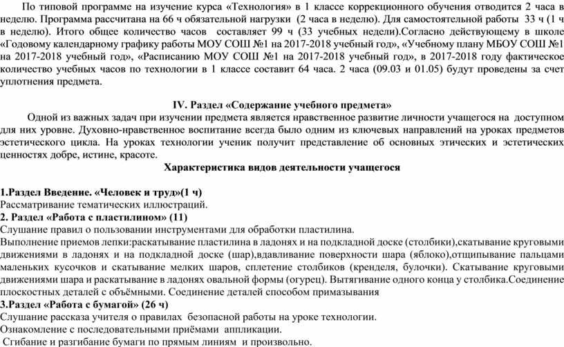 По типовой программе на изучение курса «Технология» в 1 классе коррекционного обучения отводится 2 часа в неделю. Программа рассчитана на 66 ч обязательной нагрузки (2 часа в неделю). Для самостоятельной работы 33 ч (1 ч в неделю). Итого общее количество часов составляет 99 ч (33 учебных недели).Согласно действующему в школе «Годовому календарному графику работы МОУ СОШ №1 на 2017-2018 учебный год», «Учебному плану МБОУ СОШ №1 на 2017-2018 учебный год», «Расписанию МОУ СОШ №1 на 2017-2018 учебный год», в 2017-2018 году фактическое количество учебных часов по технологии в 1 классе составит 64 часа. 2 часа (09.03 и 01.05) будут проведены за счет уплотнения предмета.