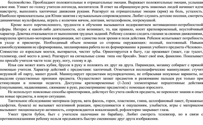 Наблюдается несформированность эмоционально-волевой сферы. В связи со спецификой эмоциональной сферы, неразвитостью волевых процессов, ребенок не способен произвольно регулировать свое эмоциональное состояние в ходе любой организованной деятельности, что иногда проявляется в негативных поведенческих реакциях (машет руками и ногами). Незнакомые ощущения или звуки вызывают страх, резкое повышение тонуса конечностей, двигательное беспокойство. Преобладают положительные и отрицательные эмоции. Выражает положительные эмоции, услышав свое имя. Узнает по голосу учителя-логопеда, воспитателя. В ответ на обращенную речь знакомых людей начинает идти навстречу, выполнять хаотичные движения руками. Реагирует на отрицательные эмоции (крик) на боль, усталость. Наиболее привлекательны для Юлии занятия с музыкальным сопровождением. Любит слушать детские песенки, смотреть динамичные мультфильмы, играть с колючим мячом, лентами, металлофоном, погремушкой.
