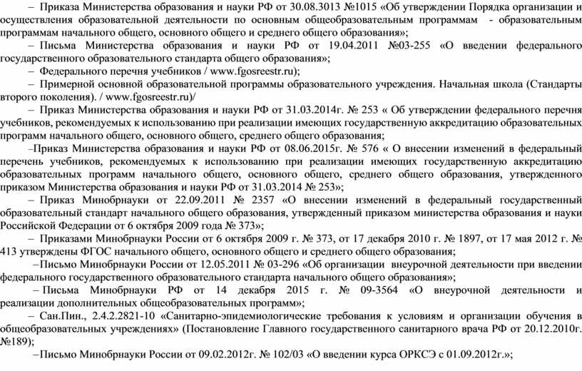 – Приказа Министерства образования и науки РФ от 30.08.3013 №1015 «Об утверждении Порядка организации и осуществления образовательной деятельности по основным общеобразовательным программам - образовательным программам начального общего, основного общего и среднего общего образования»;
