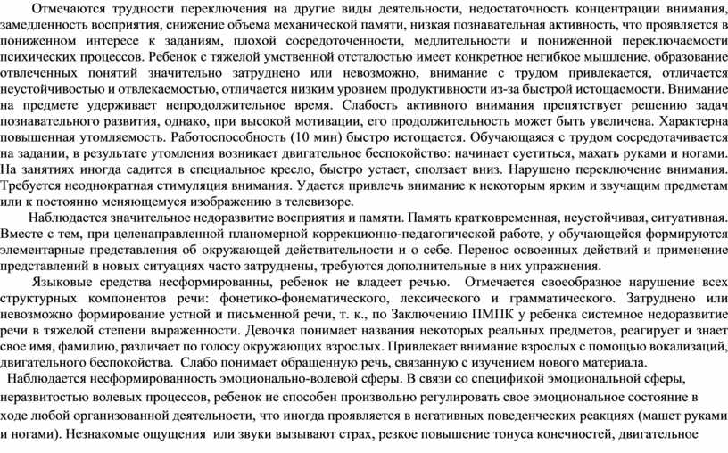 Отмечаются трудности переключения на другие виды деятельности, недостаточность концентрации внимания, замедленность восприятия, снижение объема механической памяти, низкая познавательная активность, что проявляется в пониженном интересе к заданиям, плохой сосредоточенности, медлительности и пониженной переключаемости психических процессов. Ребенок с тяжелой умственной отсталостью имеет конкретное негибкое мышление, образование отвлеченных понятий значительно затруднено или невозможно, внимание с трудом привлекается, отличается неустойчивостью и отвлекаемостью, отличается низким уровнем продуктивности из-за быстрой истощаемости. Внимание на предмете удерживает непродолжительное время. Слабость активного внимания препятствует решению задач познавательного развития, однако, при высокой мотивации, его продолжительность может быть увеличена. Характерна повышенная утомляемость. Работоспособность (10 мин) быстро истощается. Обучающаяся с трудом сосредотачивается на задании, в результате утомления возникает двигательное беспокойство: начинает суетиться, махать руками и ногами. На занятиях иногда садится в специальное кресло, быстро устает, сползает вниз. Нарушено переключение внимания. Требуется неоднократная стимуляция внимания. Удается привлечь внимание к некоторым ярким и звучащим предметам или к постоянно меняющемуся изображению в телевизоре.
