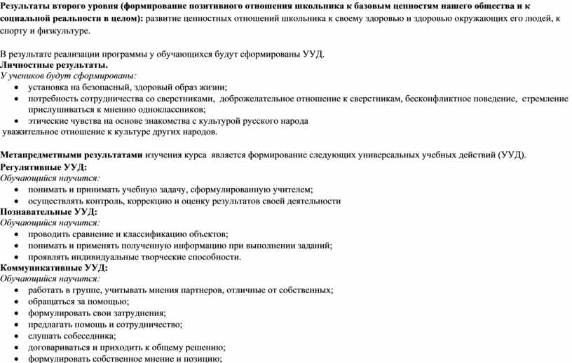 Результаты второго уровня (формирование позитивного отношения школьника к базовым ценностям нашего общества и к социальной реальности в целом): развитие ценностных отношений школьника к своему здоровью и здоровью окружающих его людей, к спорту и физкультуре.