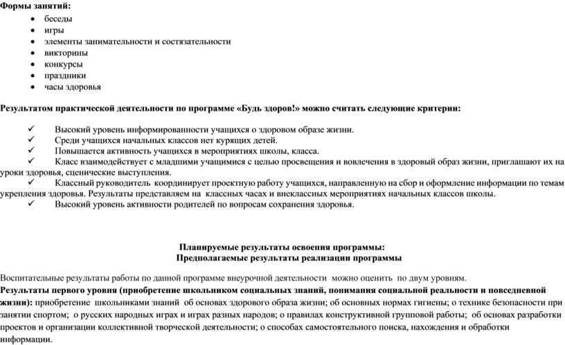 Результатом практической деятельности по программе «Будь здоров!» можно считать следующие критерии: