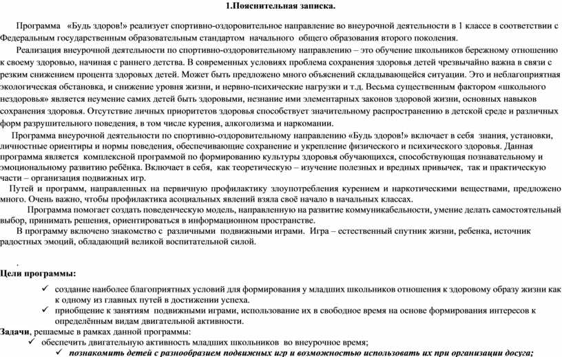 Программа внеурочной деятельности по спортивно-оздоровительному направлению «Будь здоров!» включает в себя знания, установки, личностные ориентиры и нормы поведения, обеспечивающие сохранение и укрепление физического и психического здоровья. Данная программа является комплексной программой по формированию культуры здоровья обучающихся, способствующая познавательному и эмоциональному развитию ребёнка. Включает в себя, как теоретическую – изучение полезных и вредных привычек, так и практическую части – организация подвижных игр.