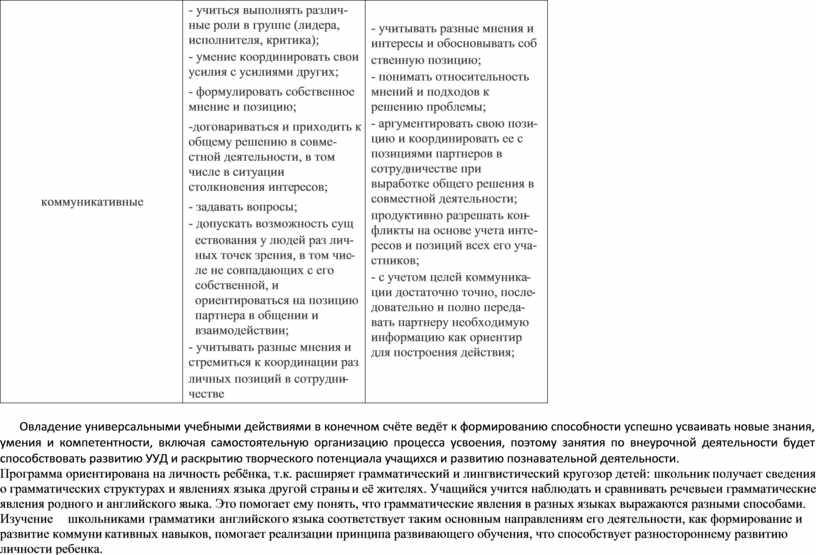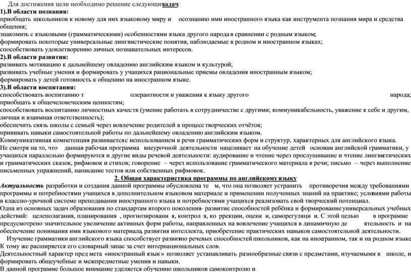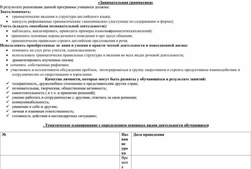 Программный материал внеурочной деятельности учащимся возможность развить и углубить свои знания английской грамматики, способствует активизации их мыслительных и творческих умений, формирует мировоззрение учащихся, предусматривает толерантное принятие языковых ценностей другого народа.