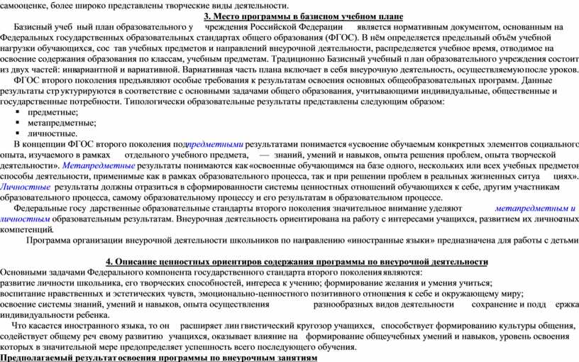 4. Описание ценностных ориентиров содержания программы по внеурочной деятельности