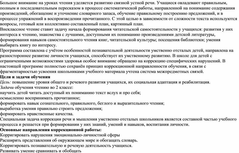 Программа составлена с учётом особенностей познавательной деятельности умственно отсталых детей, направлена на разностороннее развитие личности учащихся, способствует их умственному развитию. В школе для детей с ограниченными возможностями здоровья особое внимание обращено на коррекцию специфических нарушений. В настоящей программе полностью сохранён принцип коррекционной направленности обучения, в связи с фрагментарностью усвоения школьниками учебного материала учтена система межпредметных связей.
