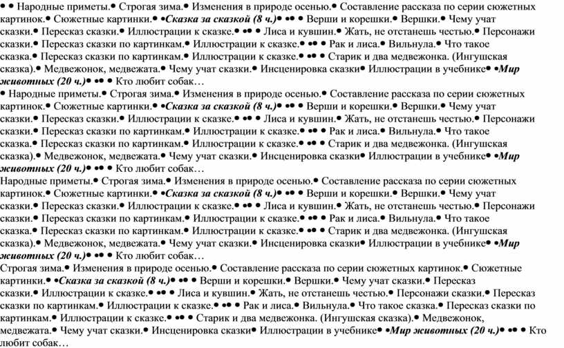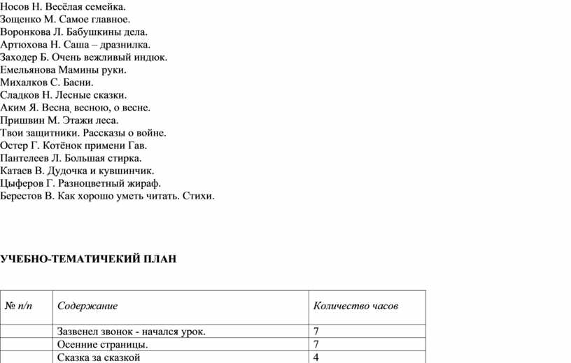 Тематика произведений для чтения подобрана с учетом максимального развития познавательных интересов детей, расширения их кругозора, воспитания нравственных качеств. Для чтения подобраны произведения народного творчества, классиков русской и зарубежной литературы, доступные пониманию статьи из газет и журналов.